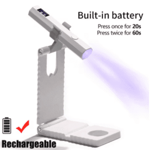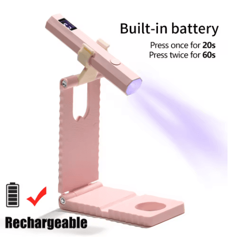 This compact UV LED nail lamp features a built-in battery, digital timer display, and foldable stand for hands-free use. With 20s/60s timer settings, it’s perfect for curing all types of gel polish. USB Type-C cable included for easy recharging—ideal for home or travel!